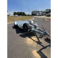 Brand new model 3500 kg hydraulically operated fully galvanised car or machinery trailer requiring no ramps for loading. Unique design allows for quick loading and unloading. Wheel arches only extend 175 mm above the trailer deck which allows opening of most any car door without interference.